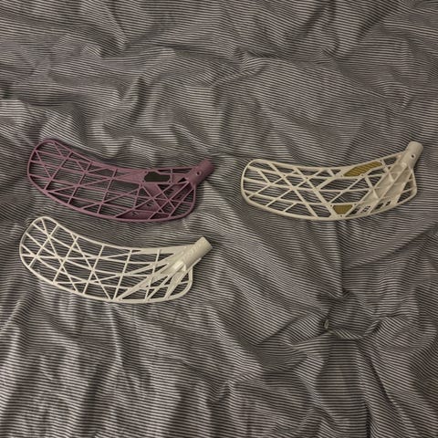 Innebandyklubbsblad i två färger, ett lila och ett vitt. För innebandyspel där man vill byta eller uppgradera blad på sin klubba