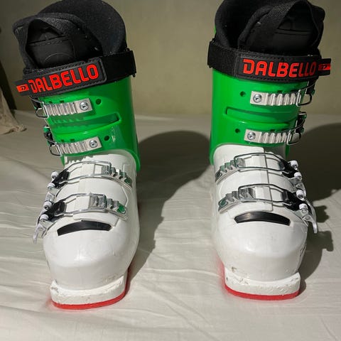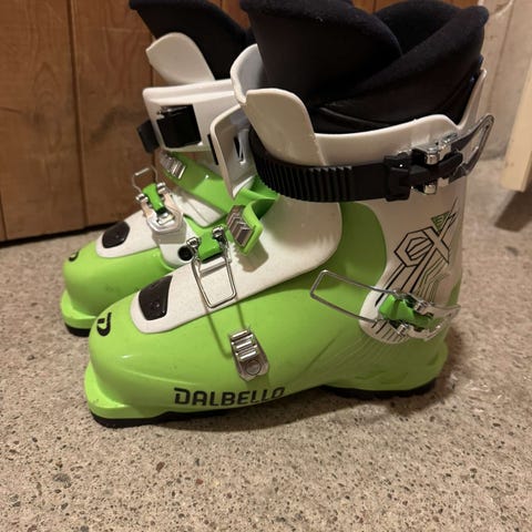 Fina Dalbello DRS 50 alpina pjäxor i grön och vit färg. Modellen har fyra justerbara spännen i metall och rem upptill för enklare på- och avtagning. Innerstövel med svart vaddering för komfort. Passar för alpin skidåkning i pistskidor och är avsedd att användas med vanliga alpina bindningar. 310 cm storlek 26,5
