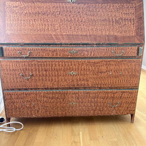 Gammal svartmålad byrå med tre stora lådor och flera små. Kan användas som skrivbord/sekretär om man vill. Snyggt sliten. Fina porslinsknoppar. Lådorna går väldigt lätt. Inköpt för 3 000 i inredningsbutik för några år sedan. Priset kan diskuteras vid snabb affär.