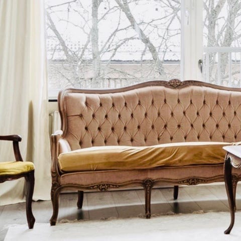 Stoppad sits och rygg med dekorativa knappar. Träram med armstöd och utsvängda ben.