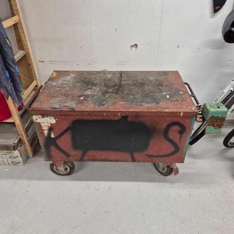 Verktygsvagn i plåt med lock och förvaring. Vagnen är blå och står på fyra hjul för enkel förflyttning. Invändigt finns rymligt utrymme för verktyg och tillbehör, med möjlighet att ordna hyllor eller insatser efter behov. Passar som mobil förvarings- och arbetsstation i garage, verkstad eller på byggarbetsplats. Pris per st - 3000kr. Verktygsvagnar säljas tomma. Kan leverera genom Stockholms område enligt ÖK mot betalning.