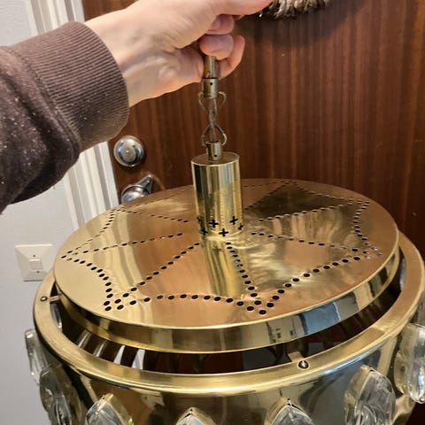 Kopparplåt med dekor av röda glasknappar på sidorna, ca 27 x 27 cm. Höjd ca 26 cm exklusive kopp. Etikettmärkt i koppen som sitter emot taket.