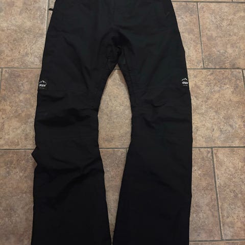 Skalbyxor med justerbar midja med integrerat bälte och med snölås och dragkedja i bensluten. Materialet är vattentätt (3000 mm vattenpelare) men sömmarna är endast tejpade på utsatta områden för att hindra att vatten tränger igenom. Byxorna är också utrustade med sidofickor och en bakficka - alla med dragkedja. Plaggets ytbehandling är fri från miljöfarliga fluorkarboner och innerfodret är färgat med energibesparande Solution Dye-teknik. Använt endast 2 gånger, sedan urvuxet. Nypris 399 kr. Endast för avhämtning.