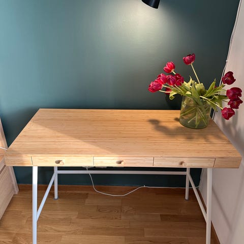 Ett helt nytt skrivbord ifrån Jysk, (VANDBORG) köptes för 375kr Märkte när jag skruva ihop den att de ej passa hos mig. Det är aldrig använt och vill gärna bli av med det så fort som möjligt, kan tänka mig att gå ner i pris för snabb affär. Finns att hämta i Västerås
