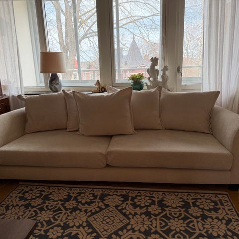 Säljer vår Harper-soffa från Mio i marinblå klädsel med tillhörande stor fotpall. Soffan är i fint skick och mycket bekväm. Det finns inga fläckar eller skador vad vi kan se!