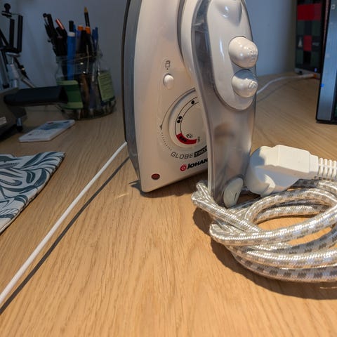 Mindre smidigt strykjärn med år på nacken men fungerar som ny, blir varmt väldigt snabbt! Bra för resan men jag har använt mina som go-to här hemma. Tar ju ingen direkt plats i en låda, perfekt för tex litet boende.