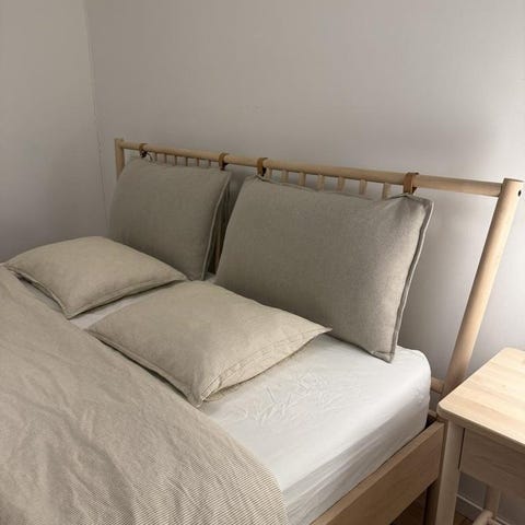 IKEA BJÖRKSNÄS sängstomme i storlek 160x200 cm. Sängram i massiv björk med lätt lutande gavlar och enkla, raka ben. Träet har en ljus, naturlig yta som passar i många sovrumsmiljöer. Mått ca: längd 214 cm, bredd 168 cm, höjd huvudgavel 109 cm, höjd fotgavel 55 cm, sänghöjd från golv ca 25 cm.