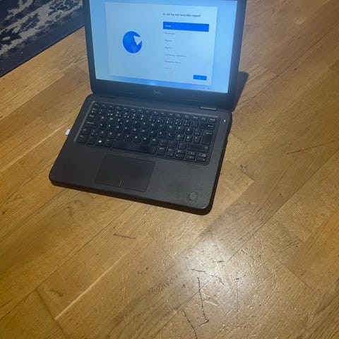 Dell Chromebook bärbar dator i svart utförande. Utrustad med tangentbord i fullstorlek och pekplatta. Operativsystemet är Chrome OS, anpassat för användning med webbläsaren Chrome och appar från Google. Lämplig för enklare kontorsarbete, studier och surf på internet. Strömadapter/kabel ansluts via sidan på datorn enligt bild.