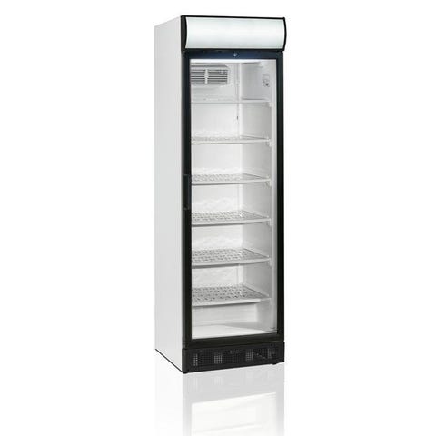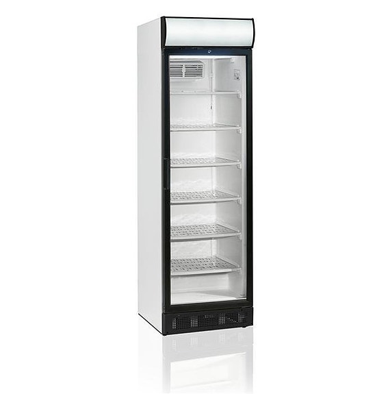 Kyld vitrin i servicemodell med isolerglas för placering på bänk. Skjutglasdörrar bak och invändig belysning.