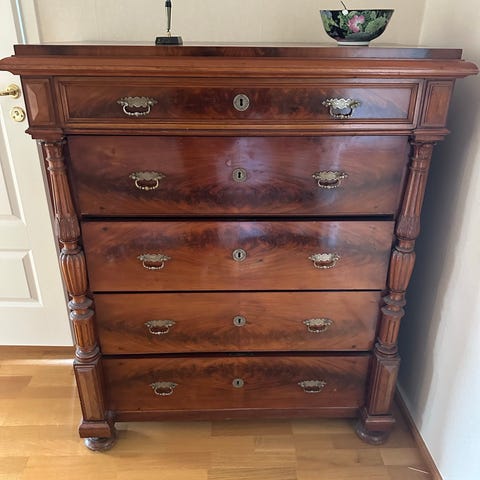 Byrå i brunlaserat trä med fem lådor. Översta delen har dekorativt snidat frontparti och de nedre lådorna är försedda med metallbeslag. Byrån står på runda fötter och har svarvade stolpar på sidorna. Passar för förvaring av kläder, textilier eller andra mindre föremål i exempelvis sovrum eller vardagsrum.