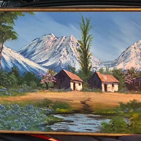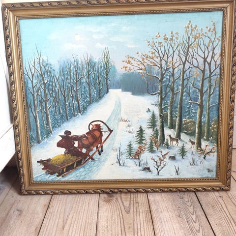 Tavla med belysning- olja på duk - ett vinterlandskap föreställande snötäckt mark, träd och vy över vatten och berg. Målningen är utförd i starka färger med tydliga penseldrag. Verket är inramat i en ljus träram. Passar som väggdekoration i exempelvis vardagsrum, hall eller kontor. 77x57 cm