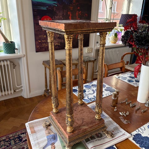 Elegant piedestal med en vacker marmorskiva. Denna piedestal är perfekt för att visa upp växter, konstverk eller andra dekorativa föremål. Dess klassiska design och guldfärgade detaljer gör den till ett stilfullt tillskott i vilket rum som helst.