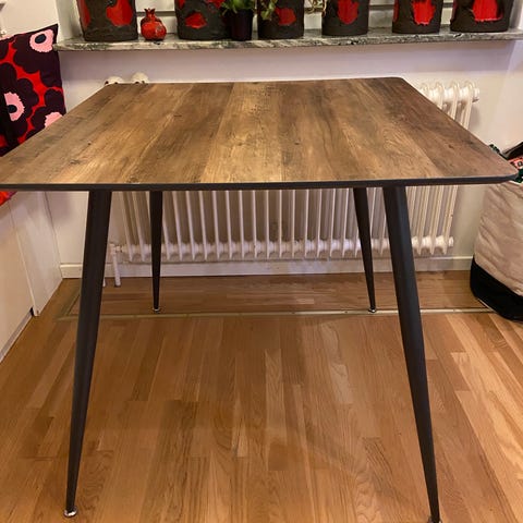 träbordsskiva och svart metallunderrede.