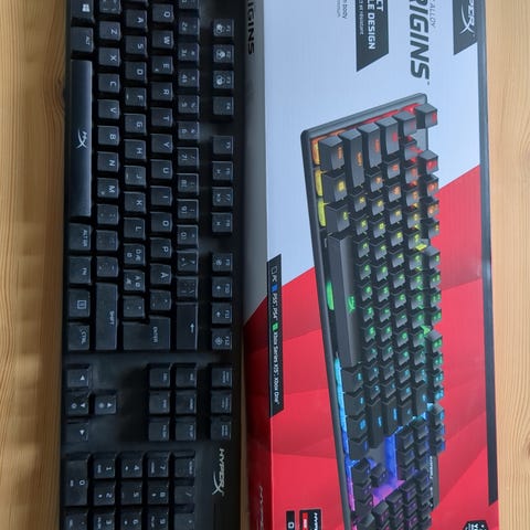 HyperX mikrofon i vitt med bordsstativ, lämplig för röstchatt, streaming eller inspelning vid dator. Razer gamingheadset i svart med kabelanslutning och mikrofon på bom, anpassat för spel och röstkommunikation. Logitech gamingmus i svart med kabel och flera knappar, avsedd för precisionsstyrning i spel. Svart fullstort tangentbord med numerisk del och kabelanslutning, lämpligt för skrivarbete och spel. Utrustningen är avsedd för användning tillsammans med stationär eller bärbar dator.