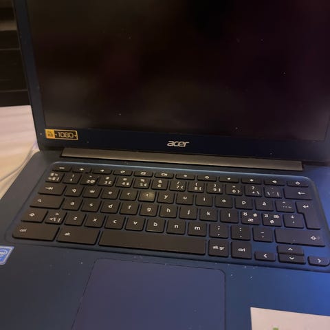 Acer Chromebook laptop i blå färg. Datorn har ett tangentbord i fullstorlek och pekplatta. Operativsystemet är Chrome OS, vilket är anpassat för webbaserat arbete och användning av appar från Chrome Web Store och Google Play (beroende på modellstöd). Utsidan har klistermärken på locket och vid handledsstödet. Chassit är tunt och bärbart, lämpligt för enklare kontorsarbete, studier, webbsurf och medieanvändning. Exakta tekniska specifikationer som skärmstorlek, processor, lagring och minne framgår inte av bilderna och kan behöva kontrolleras på enhetens systemsida.