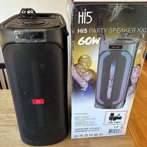 Den funkar både med bluetooth och med sladd. Strömkabel följer med. Den har 2 hjul