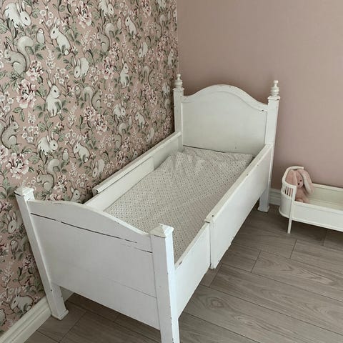 Sängen är i fintskick och har endast använts av ett barn. Det är en praktisk modell som kan förlängas i takt med att barnet växer.