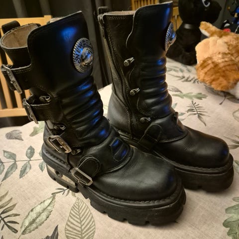Eytys stövlar i svart läder i storlek 42. Kraftig, grovmönstrad sula med markerad platå och metallplatta med Eytys-logotyp på sidan. Skaft med dragflik upptill och dekorativ rem med metallspänne runt vristen. Stövlarna är designade för vardagsbruk och kan användas under kallare säsonger tack vare den robusta sulan och det täckande skaftet. Perfekt för festival eller som vintersko.