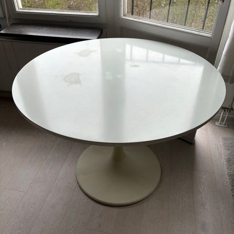 Vitt 45 cm i diameter stort avlastningsbord med svarvat ben. Bordskivan har en liten kant så att inget spill kan rinna från bordet.