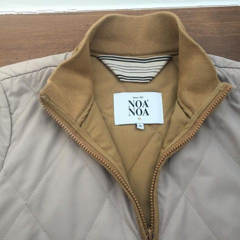 Vadderad jacka med huva och ett pepitarutigt mönster.