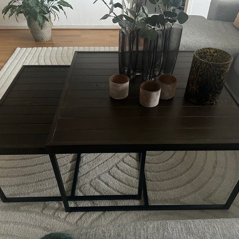 Fint soffbord. Ramen är av metall. Skivorna är glas som är täcklta i en vinylfilm med ett trämönster.