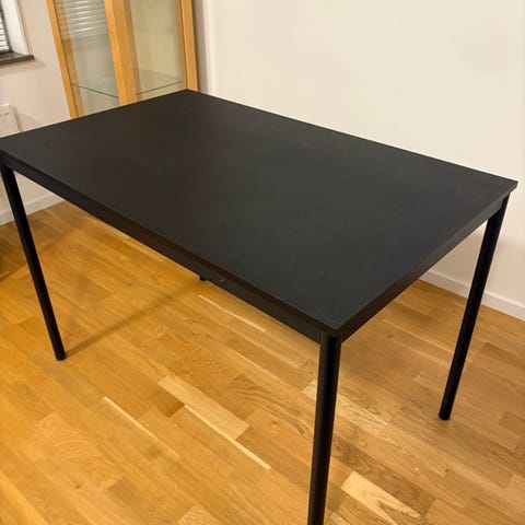 Barbord med svart bordsskiva och underrede i metall. Till bordet hör svarta barstolar. Passar som matplats eller arbetsyta i kök eller allrum.