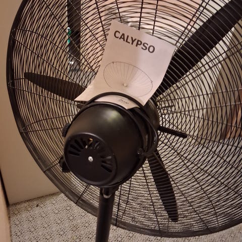 Andersson golvfläkt i vit färg. Fristående fläkt på stativ med rund fot och skyddsgaller runt rotorbladen. Utrustad med kontrollpanel på stativet för val av olika hastighetslägen. Passar för användning inomhus, exempelvis i vardagsrum, sovrum eller kök för att cirkulera luft och ge svalka.