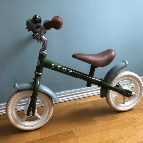 Springcykel i fint använt skick. Förvarats hemma, ingen rost. Lite repor från vanlig användning samt hantagen där gummits gått upp pga den läggs mot marken/väggen när den inte används. Inget som påverka funktionen och i övrigt inget att anmärka på. Perfekt som första cykel innan det är dags för trampor.