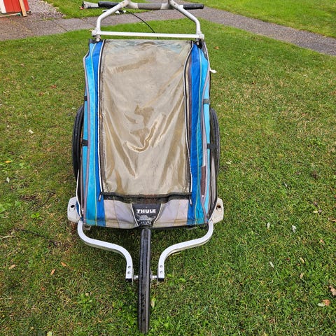 Bike & Tour cykelkärra för barn med plats för två sittplatser. Kärran har skyddande tyg- och nätkåpa framtill samt hjul på sidorna. Fäste för montering bakom cykel ingår. Avsedd för transport av barn vid cykling på väg eller cykelbana.