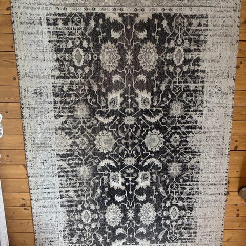 Mio matta i rektangulär form med orientaliskt inspirerat mönster i grå toner. Mattan har en markerad bård runt kanterna och ett centralt medaljongmönster. Kortsidorna avslutas med fransar. Passar exempelvis i vardagsrum, sovrum eller hall.