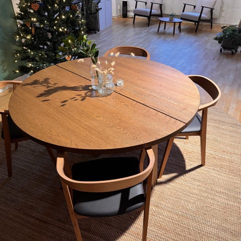 Nu säljer vi en mycket fin och modern matgrupp bestående av det eleganta matbordet Circle i valnötsfanér tillsammans med 6 st matchande Ommel-stolar. Perfekt för dig som vill ha en tidlös och varm känsla i köket eller matsalen.