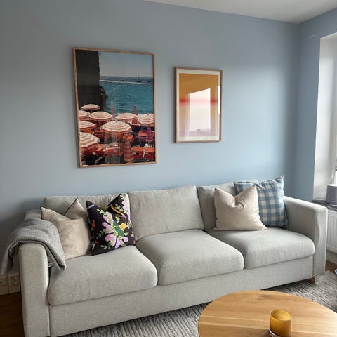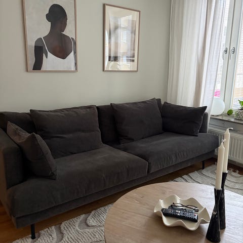 Soffan är i gott men använt skick, tyget är fortfarande helt och fint men på sittkuddarna märker man att det börjar bli lite nött. Tyget på sittkuddar och ryggkuddar är avtagbart och tvättbart. Vi har haft och älskat den i många år men behöver nu en större.