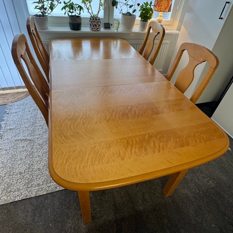 Matbord med fyra stolar i ljusbrunt trä. Bordet har rektangulär form med rundade kortsidor och står på fyra raka ben. Stolarna har ribbad rygg och sits i samma träutförande som bordet. Passar som köksbord eller matgrupp i mindre till medelstora rum. Hämtas på plats 22/2 em.