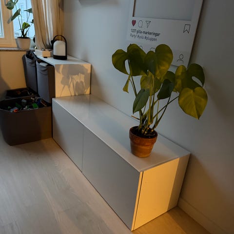 Ett Bestå väggskåp med ett trähyllplan. Mått: 64x60x42 cm. Färg på stommen: svartbrun. Färg på dörr: mörkblå.