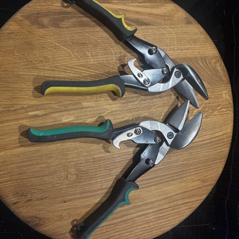 Plåtsaxar och tånger för olika användningsområden. Inkluderar en Freund plåtsax, tre Midwest plåtsaxar och en rundtång.