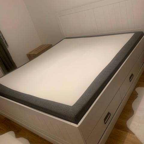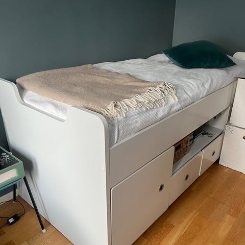 IKEA Bangsund säng med förvaring i kombination av ljust trä och vitt. Sängen har ribbotten och inbyggd förvaring i form av skåp med två skjutdörrar samt öppna hyllor på sidan. Passar som enkelsäng i sovrum eller barnrum där extra förvaringsutrymme under sängen är önskvärt. Pris med madrass 600 kr och utan madrass 400 kr. Sängen är nedmonterad men monteringsanvisning finns.