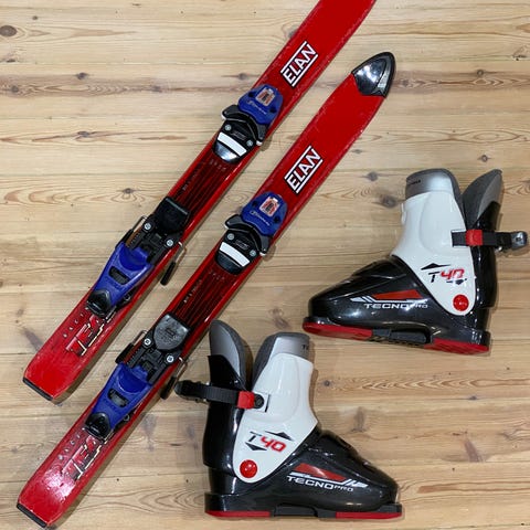 Alpina barnskidor med bindningar i olika färger. Skidorna är utrustade med integrerade bindningar anpassade för alpint bruk. Flera par visas på bilderna, med varierande längd och färgsättning. Passar för barn som åker i preparerade backar. Säljs som alpina skidor med bindningar, övriga mått och exakta modeller framgår inte av bilderna.