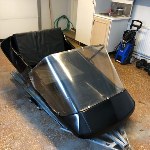 Safari skoterpulka i vit färg med vindruta framtill. Pulkan har två separata säten fram och ett baksäte, samt förvaringsutrymme under lucka i mitten. Säten fällbara framåt och lätt löstagbara. Monterad på dubbla medar med fjädring. Avsedd för transport av passagerare eller packning efter snöskoter.