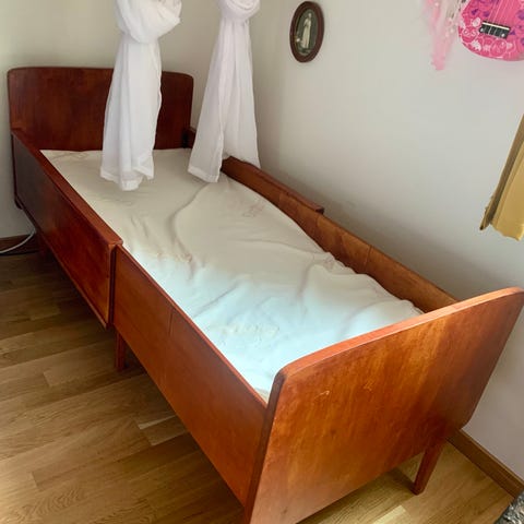 Barnsäng för baby i äldre retrostil. Klädd med fint tyghänge som går att tvätta. Liten tunn madrass i botten.