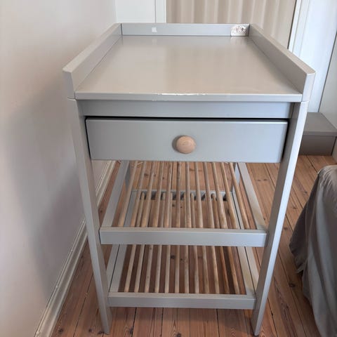 Kungligt sött skötbord i klassiskt vitt med en stiliserad grå krona målad på skåpsdörren. När skötdelen inte längre behövs lyfts den enkelt av och du får en fin förvaringsmöbel med ett skåp och tre lådor. Material: björk & MDF. Mått: bredd: 93,6 cm, djup: 52 cm, höjd: 96,8 cm.