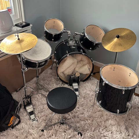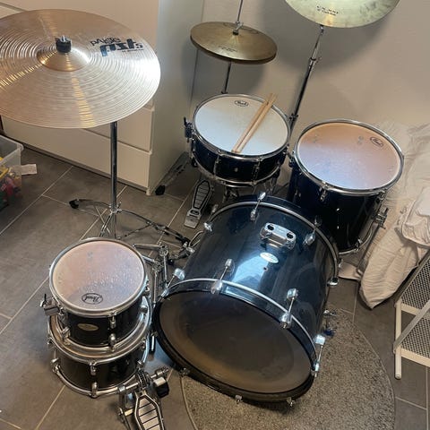 Trumset för barn i blå färg. Setet består av bastrumma med pedal, virveltrumma, pukor och en cymbal på stativ. Medföljande trumstol, hörselskydd och trumpinnar syns på bilderna. Lämpligt som nybörjartrumset för barn tack vare den mindre storleken.