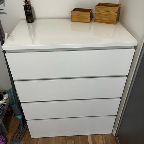 Ikea Malm byrå med tillhörande glasskiva säljes i gott skick. Byrån har märken från klister (höger sett framifrån) på ena sidan som förmodligen kan skrapas bort. Glasskivan har ingen repa eller liknande.