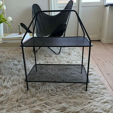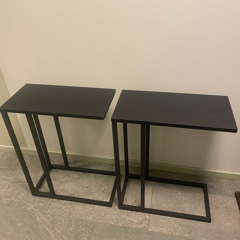 Säljer två minimalistiska och praktiska sidobord i svart pulverlackerad metall. Borden har en smart "C-formad" fot som gör att de kan skjutas in under soffkanten eller sängen för att spara plats och få ytan närmare dig.