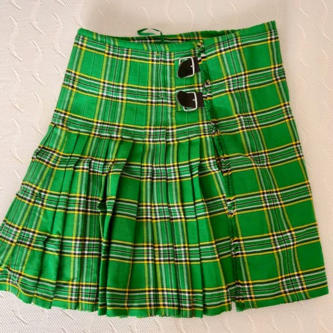 Scottish Design Tartans kilt för herr i grön tartanruta med vita och gula detaljer. Storlek 36 i midjan, motsvarande ungefär herrstorlek XL. Kilten har veckad baksida och två spännen i midjan för justering. Materialet är ett vävt tyg som kan maskintvättas varmt enligt tvättråden. Passar exempelvis till högtider, temafester eller traditionella skotska kläder. Svarta knästrumpor med grönt klövermotiv ingår som tillbehör. Kan behöva en strykning.