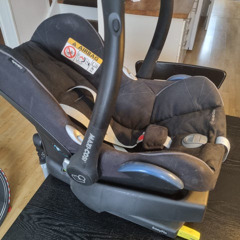 Använd till 1 barn. Snörena kanske ska tvättas eller bytas (prickiga). ca 5 år gammal. Ingår solskydd och easyfix för installation i bil.