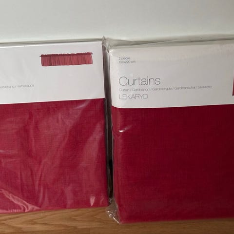 Två förpackningar med gardiner. En förpackning innehåller två röda panelgardiner i storleken 42 x 220 cm. Den andra förpackningen innehåller två mönstrade gardiner med hällor i storleken 110 x 240 cm.