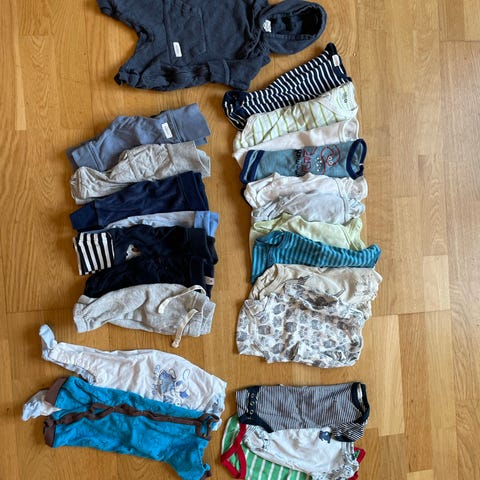 Babykläder för pojke i storlek 62. Blandat set med 10 byxor, 9 långärmade bodies, 3 korta bodies, 3 pyjamas, 2 tunna långärmade T-shirts, 1 kortärmad T-shirt, 2 linnen, 1 set med byxor och hoodie, 1 solhatt, 5 dregglisar. Blandade märke, newbie, Lindex, HM mm.