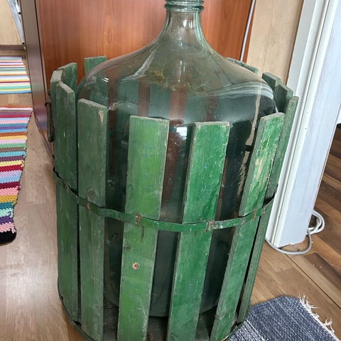 Glasdamejeanne glasdunk i genomskinligt glas. Stor rundad behållare med smal hals, lämplig som dekorationsföremål eller för förvaring av vätskor enligt behov. Färgen är klar/genomskinlig och materialet är glas.