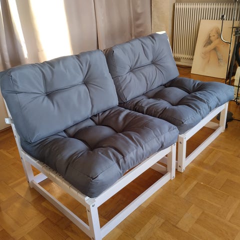 Trevlig utemöbel i trä med grå dynor och kuddar.