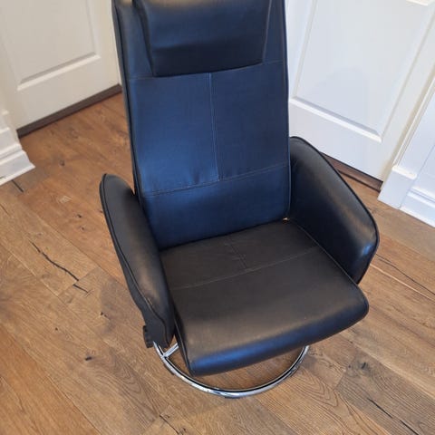 Två snurrfåtöljer med en bas i krom. Fåtöljerna är klädda i svart konstläder.